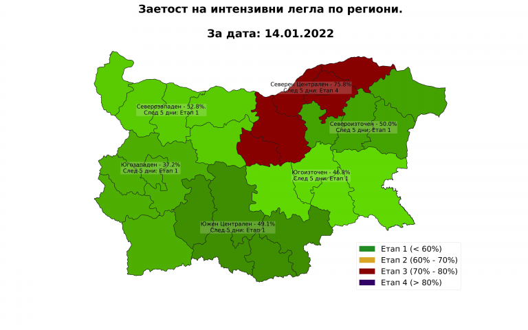 Актуална карта за заетостта на интезивните легла по региони - 14.01.2022 г.